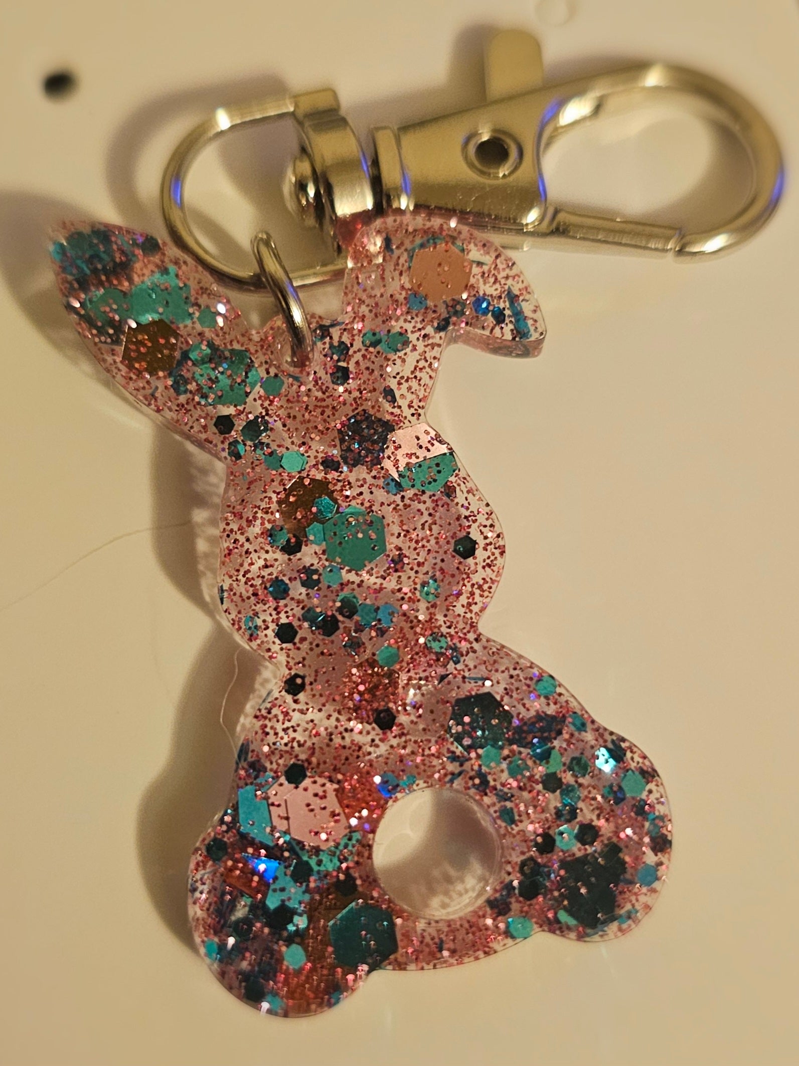 These handcrafted coral-pink glitter bunny silhouettes dangle from elegant faux pearl studs. Each bunny charm is made of glossy resin with embedded sparkles and a small circular cutout at the base for a playful detail. Lightweight and fun, they add a pop of pastel charm to any outfit. Perfect for Easter or spring celebrations, they make an adorable novelty gift or a festive accessory to brighten up your look.